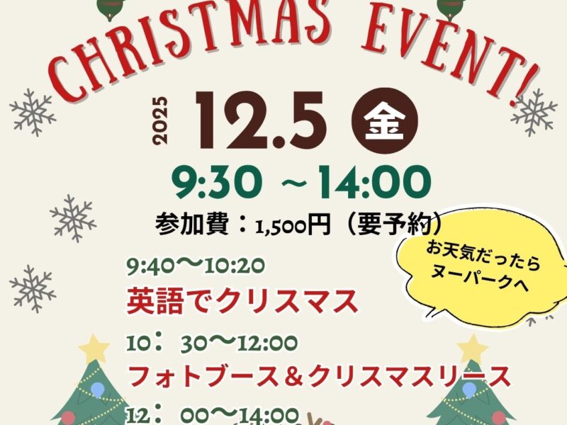 日時:12月5日(金)9:40〜14:00参加費:1,500円/1家族(要予約)※1人45分無料託児サービス付 みんなで楽しめる、かわいくてワクワクいっぱいのクリスマスイベントです🎄& …